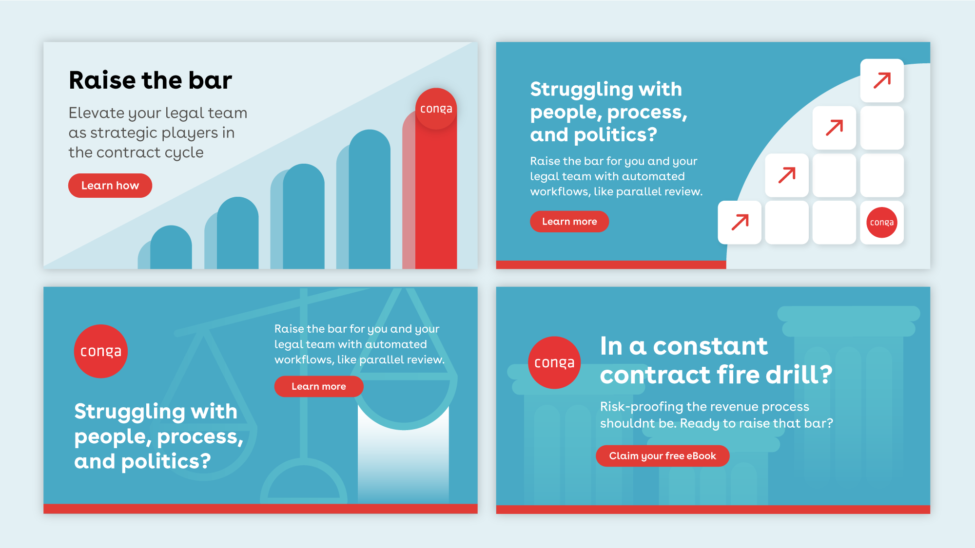 While at Conga, I had the opportunity to work closely with the Demand Generation team on various campaigns of different scales. This project is an example of a persona-based integrated campaign with multi-channel activities. I led our Design team in collaboration with the Global Campaigns team through kickoff, concepting, and execution of deliverables.