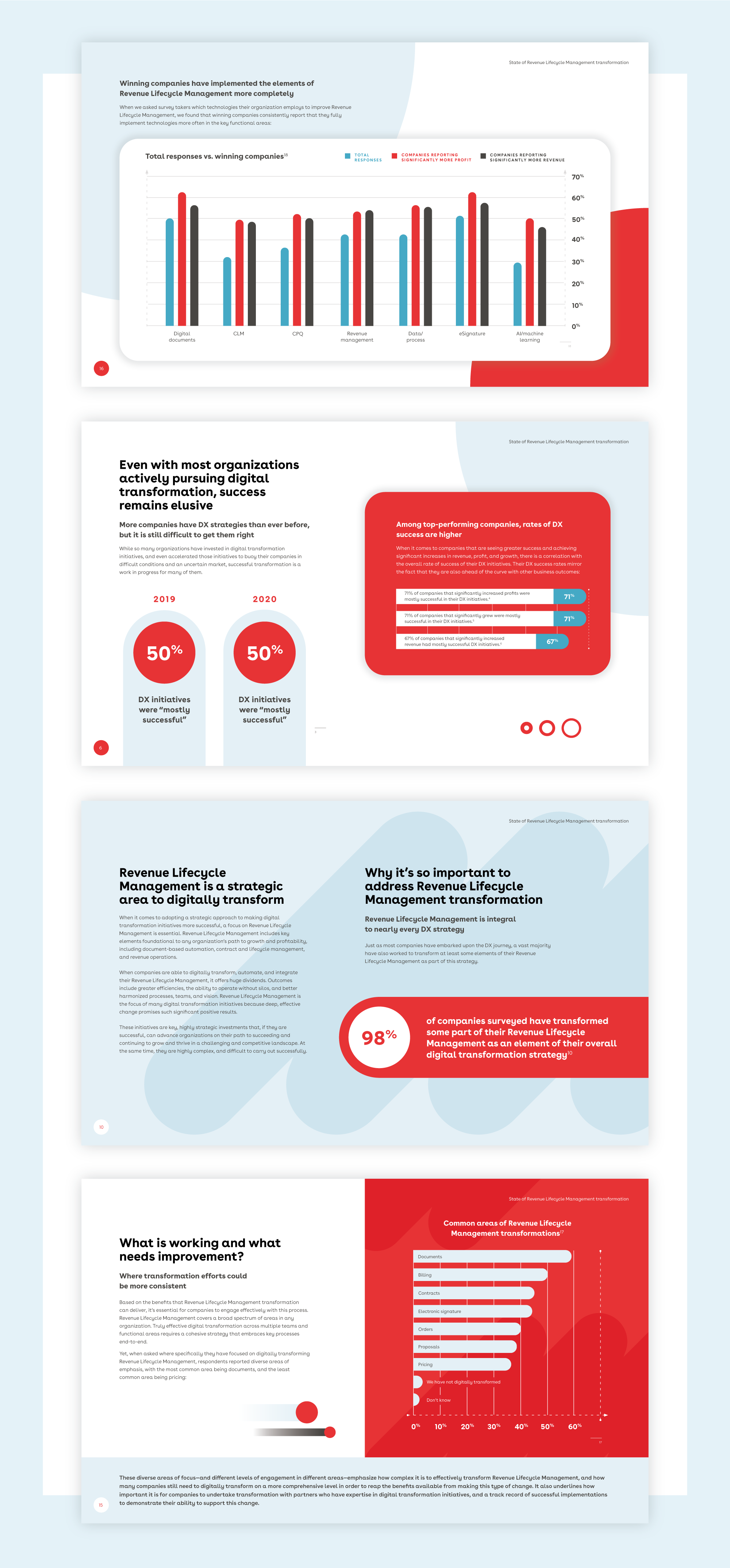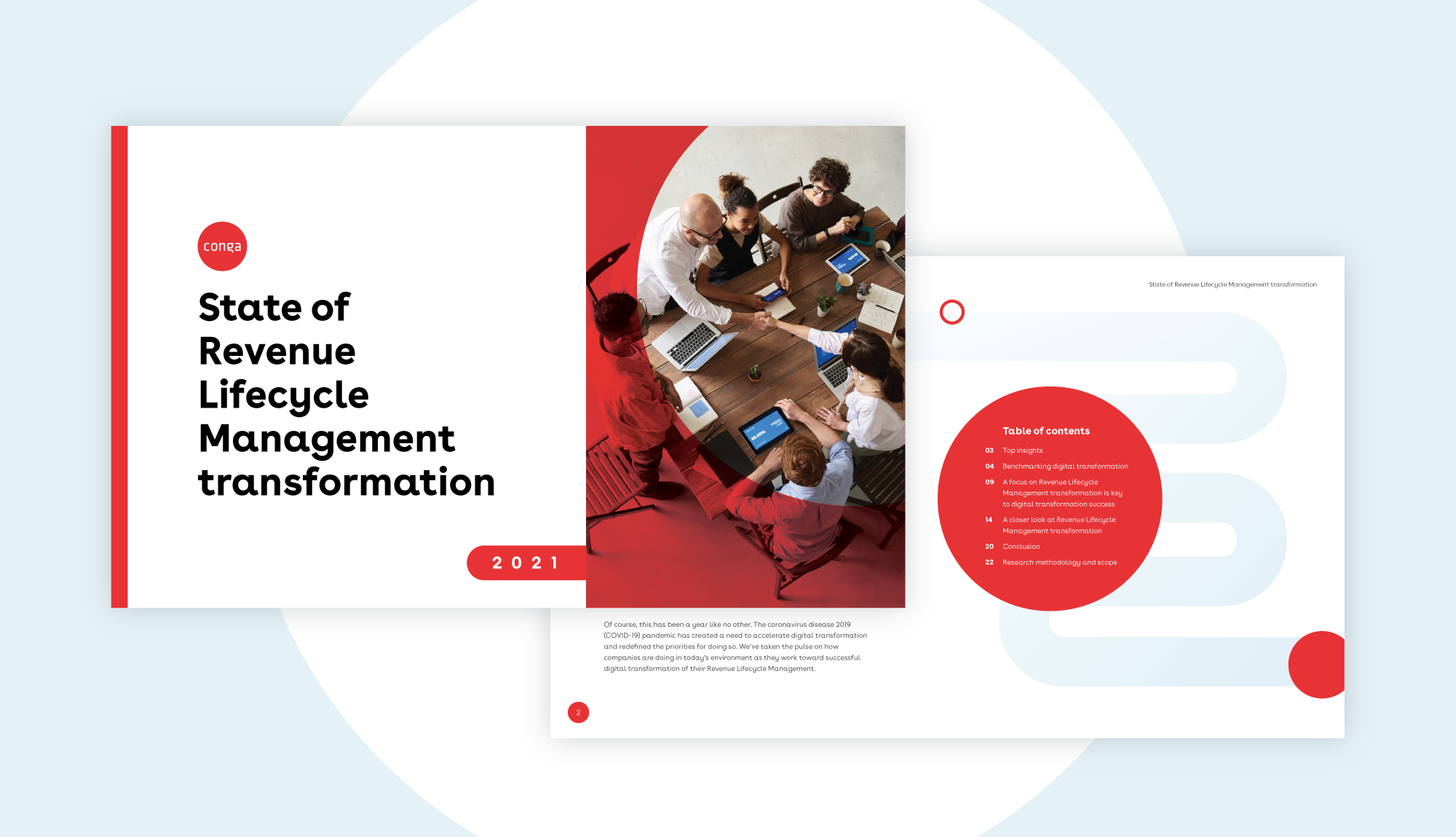 As one of Conga’s largest literature pieces, brimming with data and information, it was important to create a digestible but visually interesting report. The Conga brand calls for round and friendly shapes, so we applied the same approach to the charts and graphs. Additionally, this report established a style guide for data visuals for future reports and applications.